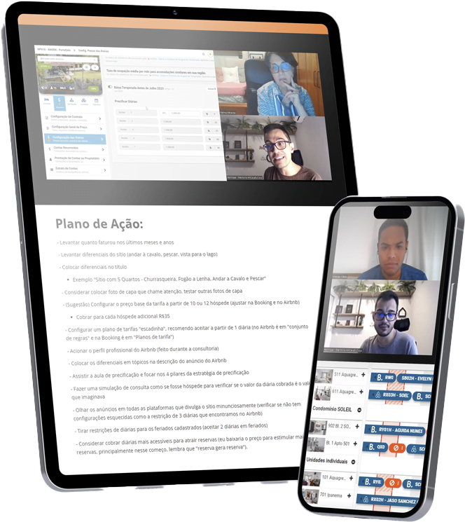 Na Consultoria Individual, você terá acesso a uma chamada de vídeo onde vamos entender seus desafios atuais para traçar um diagnóstico que ofereça soluções sob medida para seu momento atual. Também iremos analisar os anúncios da sua acomodação e identificar os pontos de melhoria que irão alavancar suas reservas. Ao fim da Consultoria, você terá em mãos uma listagem das ações recomendadas que servirá como um guia de execução das soluções propostas.